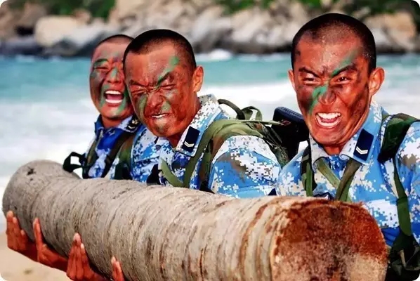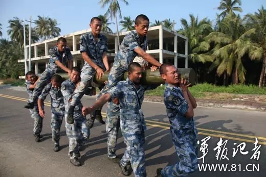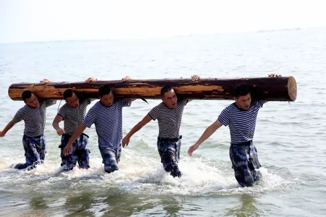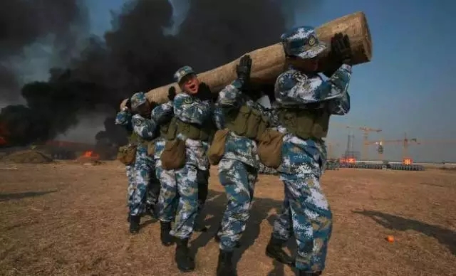 图为海军陆战某旅进行扛圆木特种作战训练,残酷的训练磨练了队员们永不言败的钢铁意志,而扛圆木仅仅是每名陆战队员的入门课。