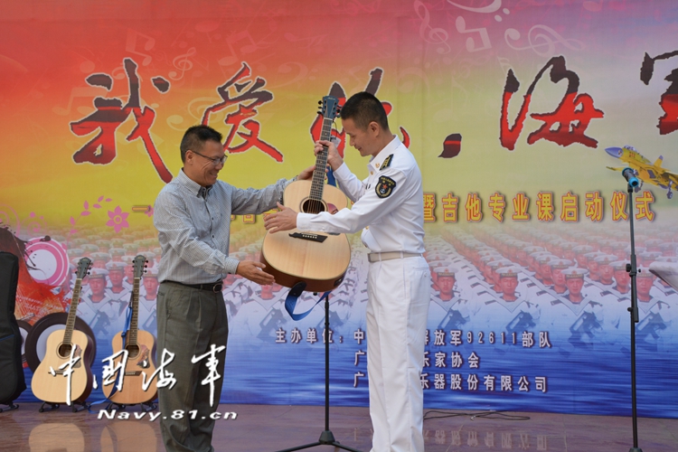 中国海军网讯 (姜峰、陈杰)11月16日,中国音乐家协会流行音乐学会副主席陈洁明、广东红棉乐器股份有限公司董事长何志强为南海舰队装备部某修管处官兵们送来吉他专业教程大餐和百余把免费专款定制的吉他。