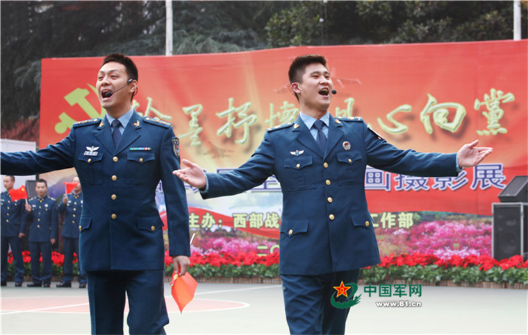 演出队战士现场唱起官兵耳熟能详的经典歌曲。 梁杰 摄