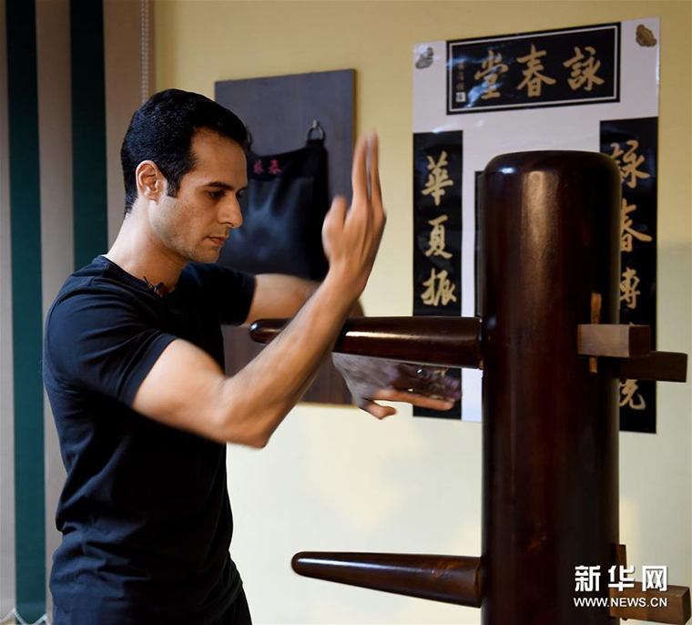 2016年3月1日,在埃及开罗,埃及人穆罕默德·诺厄展示咏春拳法。穆罕默德·诺厄是埃及唯一一家由中国叶问宗师传人开设的武馆的掌门人。赵丁喆 摄