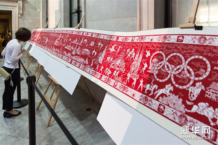 2016年7月13日,在美国纽约曼哈顿联邦国家纪念堂,一名参观者在“风雅常州”中美文化交流暨艺术作品展上欣赏金坛刻纸作品《从雅典到北京》。此次艺术展展示了中国传统的工艺作品和现代的书画艺术。李木子 摄