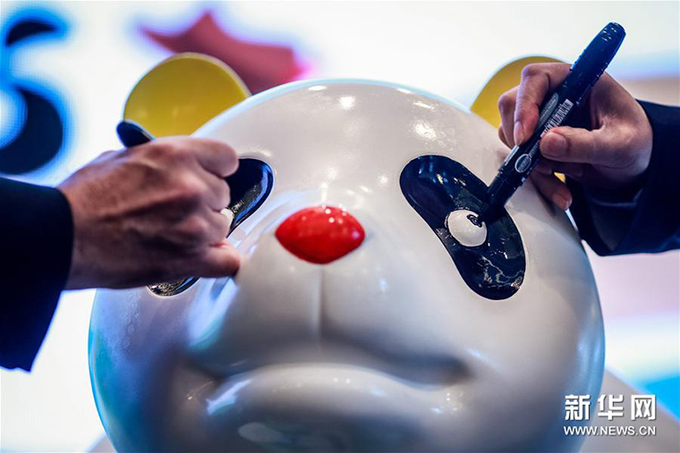 2016年9月2日,在德国柏林,来宾在“熊猫走世界——美丽中国”全球旅游推介活动首站启动仪式上为大熊猫模型点睛。张帆 摄