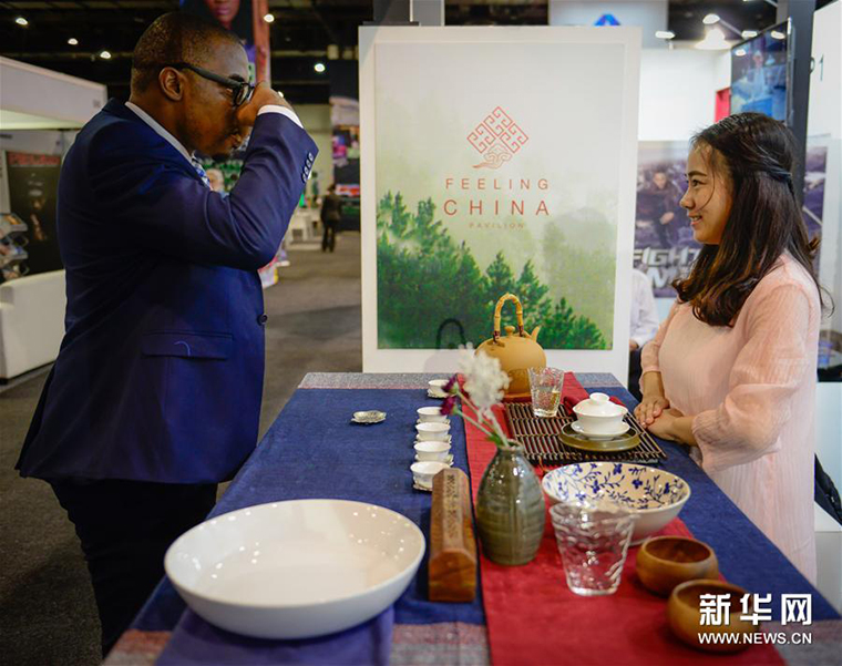 2016年11月2日,在南非约翰内斯堡举行的2016年非洲电视节上,一名男子在中国联合展台前品茶。翟健岚 摄