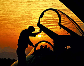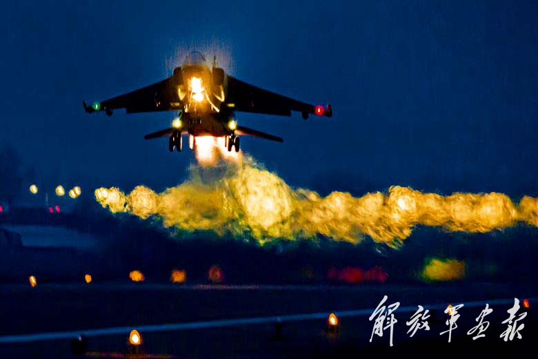 军人、武器与夜色结合,有简洁明快、雷厉风行的战斗风采,蕴含浓重的“绝杀”味道。《新年首飞》和《浴火演兵场》在拍摄时机的把握上,不约而同选择了夜景,是成功的原因:夜色,使主体突出;夜色,使画面简洁;夜色,使主题深化。