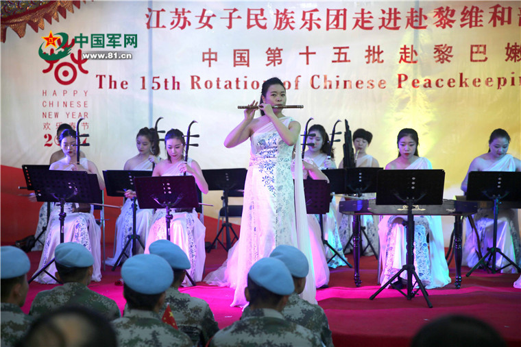 贝鲁特时间2月13日下午,中国驻黎大使馆、江苏女子民族乐团专程前往中国第15批赴黎维和部队进行慰问演出。图为乐团人员正在进行笛子与乐队演奏《挂红灯》的场景。郝高攀 摄