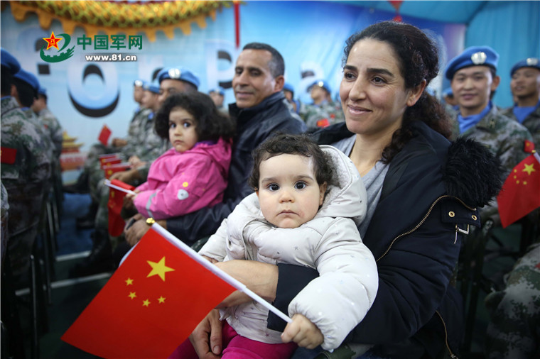贝鲁特时间2月13日下午,中国驻黎大使馆、江苏女子民族乐团专程前往中国第15批赴黎维和部队进行慰问演出。图为受邀外宾受到中国古典音乐感染,“洋娃娃”摇起中国国旗的画面。郝高攀 摄