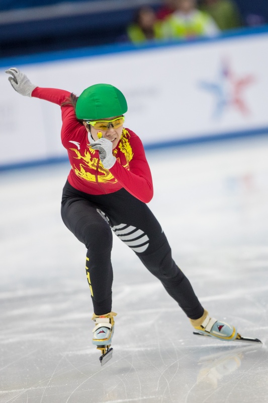 2月26日,中国队选手王润园在比赛中。当日,在俄罗斯索契举行的第三届冬季世界军人运动会短道速滑3000米混合接力比赛中,由杨帅、吕修诚、王润园、吴仪组成的中国队夺得铜牌。新华社记者吴壮摄