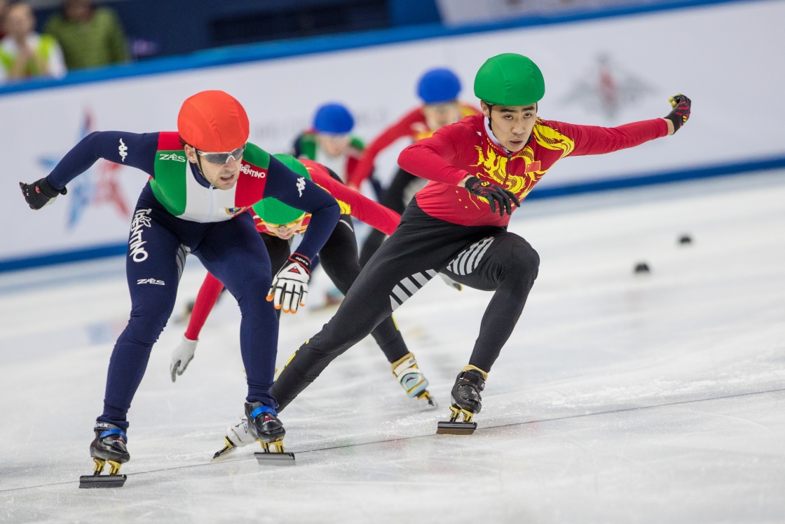 2月26日,中国队选手杨帅(右一)在比赛中。当日,在俄罗斯索契举行的第三届冬季世界军人运动会短道速滑3000米混合接力比赛中,由杨帅、吕修诚、王润园、吴仪组成的中国队夺得铜牌。新华社记者吴壮摄