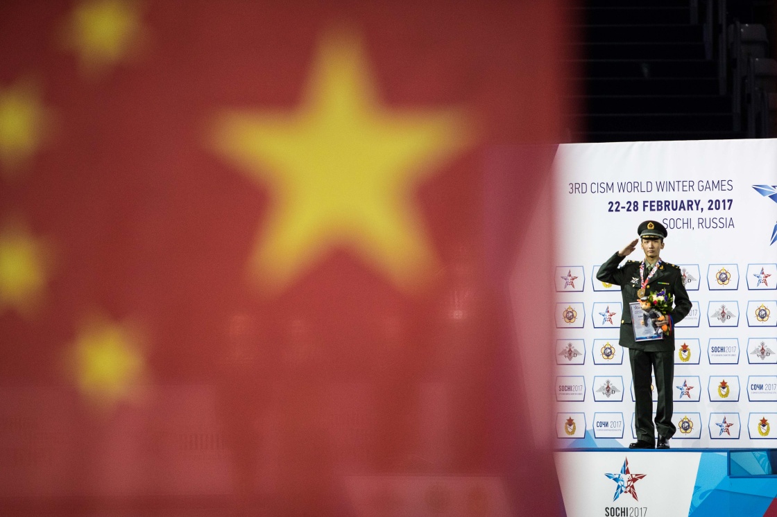 2月25日,中国选手许宏志在颁奖仪式上。当日,在索契举行的第三届冬季世界军人运动会短道速滑男子1000米决赛中,中国选手许宏志以1分29秒004的成绩获得第三名。新华社记者吴壮摄