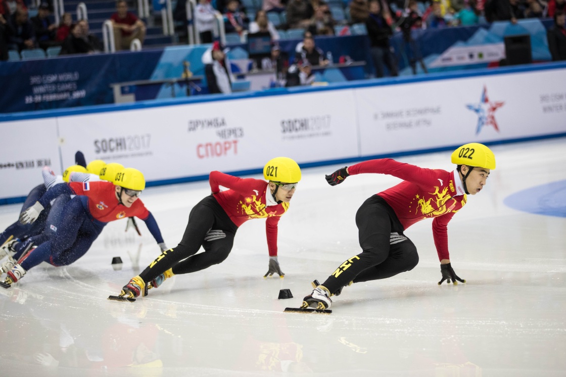 2月25日,中国选手杨帅(右一)、许宏志(右二)在决赛中。当日,在索契举行的第三届冬季世界军人运动会短道速滑男子1000米决赛中,中国选手许宏志以1分29秒004的成绩获得第三名。新华社记者吴壮摄
