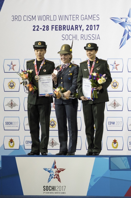 2月25日,中国选手杨扬(左)、王润园(右)与冠军、意大利选手阿丽亚娜在颁奖仪式上合影。当日,在索契举行的第三届冬季世界军人运动会短道速滑女子1000米决赛中,中国选手杨扬以1分31秒943的成绩获得亚军,队友王润园以1分32秒234的成绩获得季军。新华社记者吴壮摄