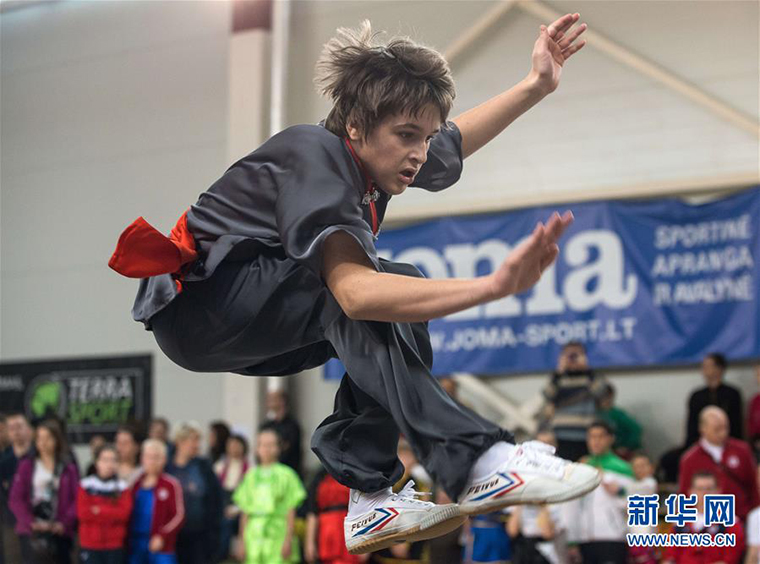 一名选手在比赛中。当日,立陶宛第三届武术公开赛在首都维尔纽斯举行。 阿尔弗雷达斯·普里亚迪斯 摄