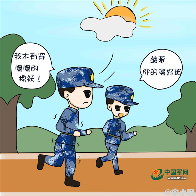 情景一:一日之计在于晨,军校生活每天的开始就是出操。然而,总有那么一些“二货”忘记调宽腰带,没办法只能放弃暖暖的棉袄,匆忙披上单薄的上衣,北方的清晨,在寒风中冻得骨骼肌不自主颤抖。