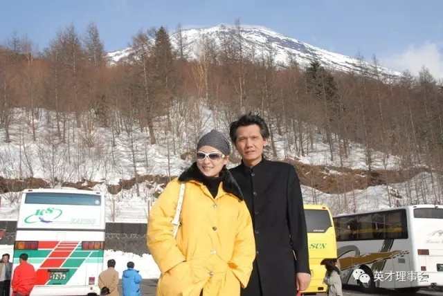 随中国书法家代表团出访日本,与夫人合照于富士山