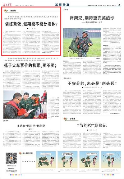 根据《士官管理规定》,士官因个人特殊情况,经团(旅)级单位首长批准,可将当年假期分两段安排。火箭军某团结合实际,制订了《士官分段休假方案》,初级士官假期原则上一次休完,中士以上士官、已婚士官、关键岗位人员根据需要,可以提出“分段休假”申请,“见缝插针”休完假、休好假。请看今日《解放军报》的报道——