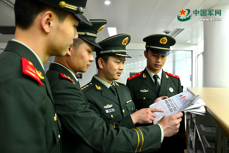 官兵在图书馆内翻看《解放军报》。潘政 摄。