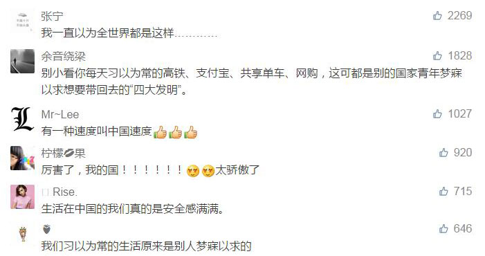 有网友评论“我们习以为常的生活原来是别人梦寐以求的”“有一种速度叫中国速度”。