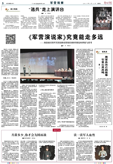 身边人讲述身边事。一期期《军营演说家》别开生面,它打破官兵们对传统思想政治教育的理解,以一种更加温和新潮的形式出现,官兵们在轻松自如的环境中,受感染、得教育。让我们跟着今天出版的《解放军报》一起走进《军营演说家》,去听一听官兵们的故事。