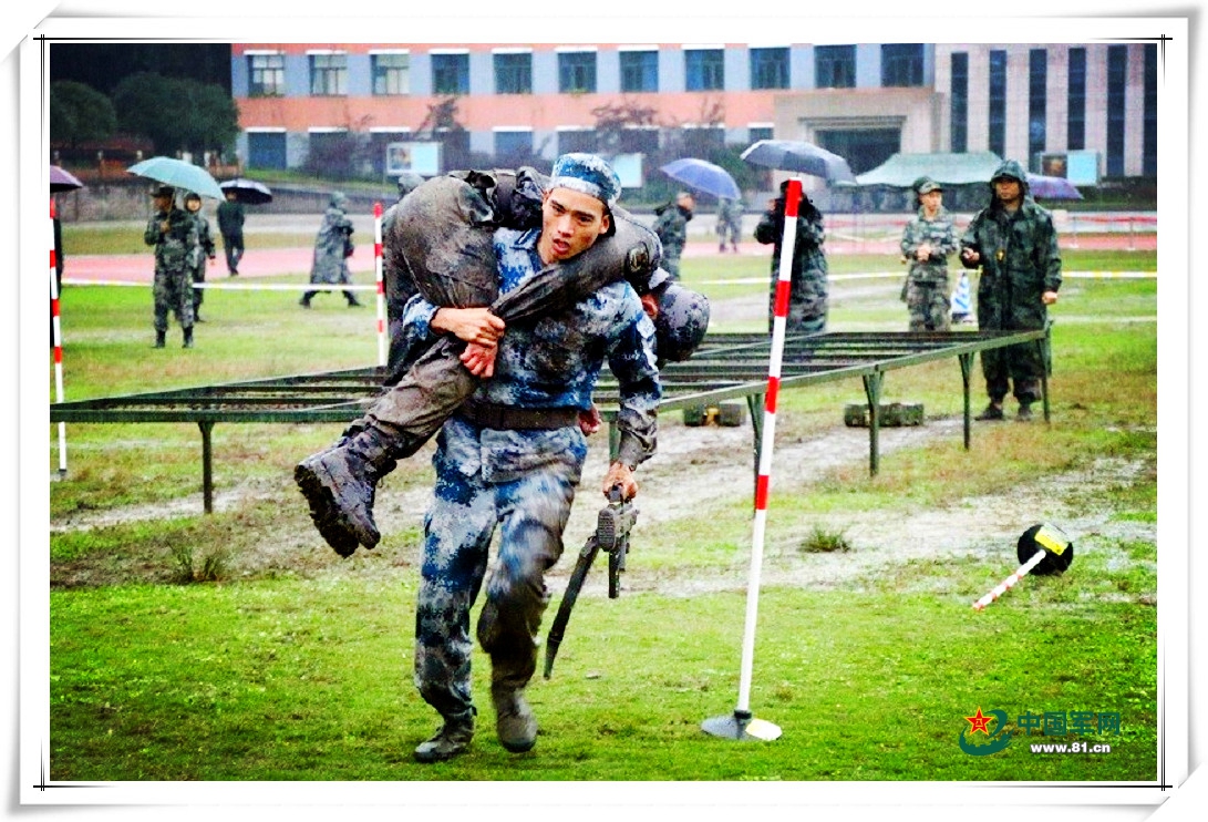 【镜头四】救护组合:持枪奔跑、匍匐前进、背负伤员,我们为了抢救受伤的战友争分夺秒,拼尽全力。在时光定格的这一刻,我们充分咀嚼着拼搏的滋味,所有的动作只为诠释着:团结、向前、胜利。