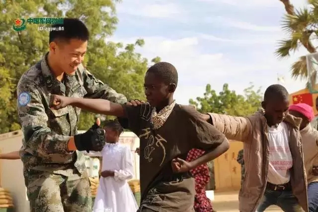 中国赴马里维和部队举行“维和营开放日”活动,维和官兵向学生代表传授中国功夫。 韩立建 摄