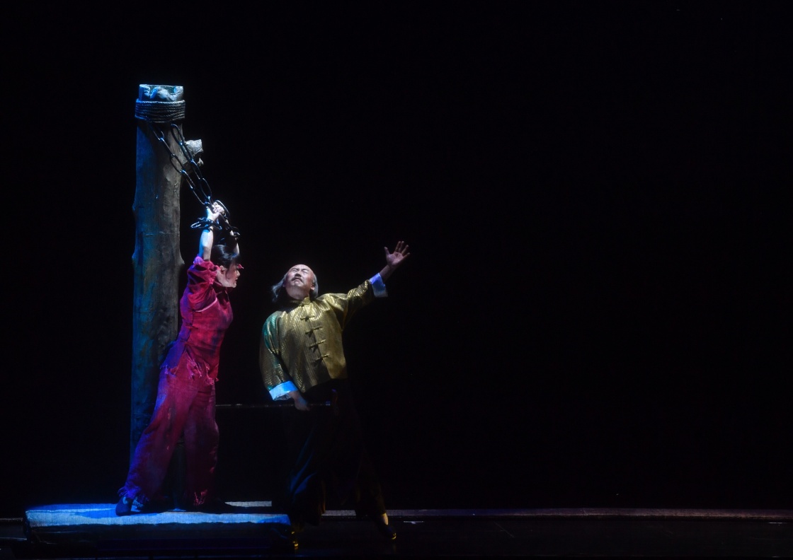 6月15日,王庆爽(左)、陈淼在歌剧《红色娘子军》中分别饰演吴琼花和南霸天。新华社记者 金良快 摄