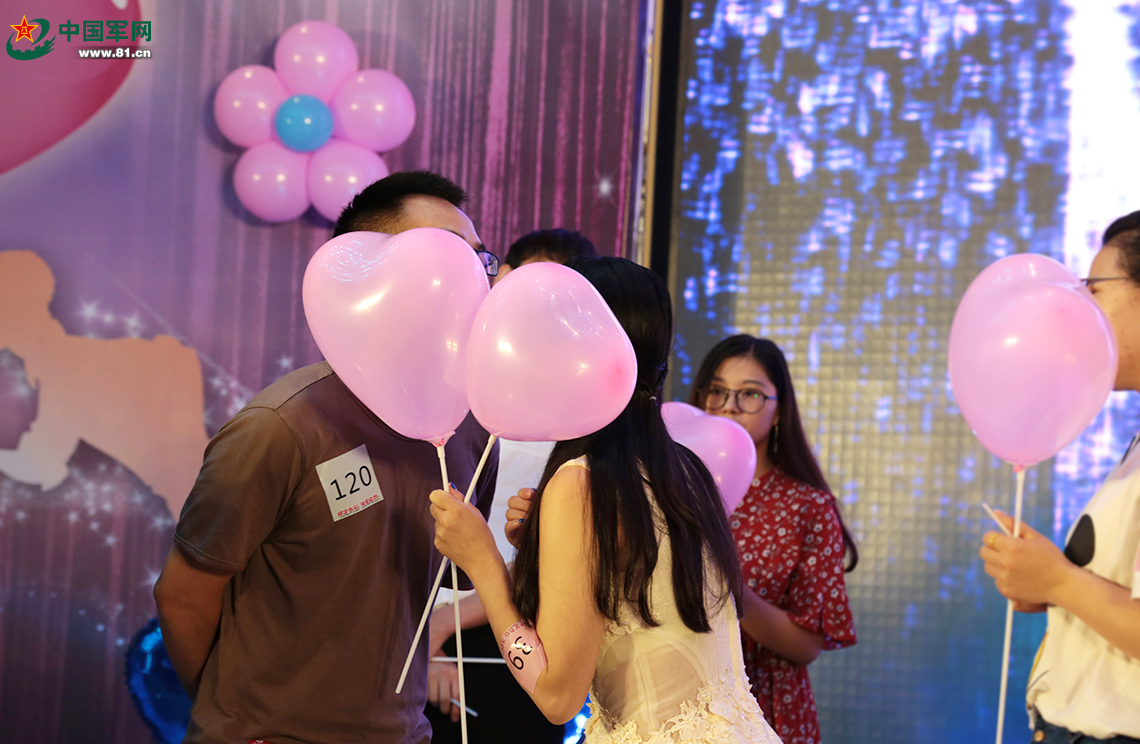 相亲交友会上,一名女嘉宾与兵哥哥进行游戏互动。 李明摄