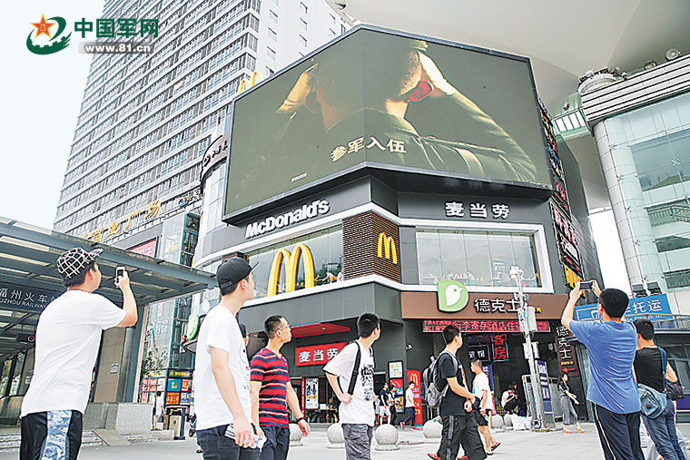 6月25日,在福州市动车站南广场出站口上方的大型LED广告屏上播放的征兵宣传短片吸引了不少适龄青年驻足观看。徐文涛 摄