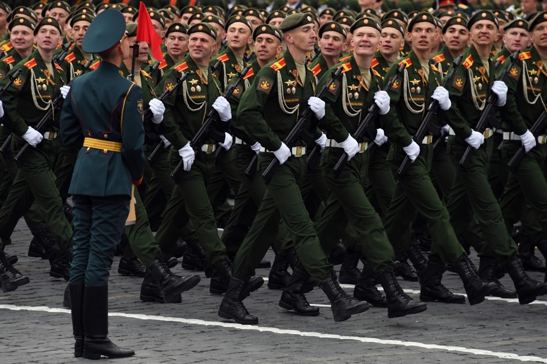 5月9日,在俄罗斯首都莫斯科,军人列队走过红场。