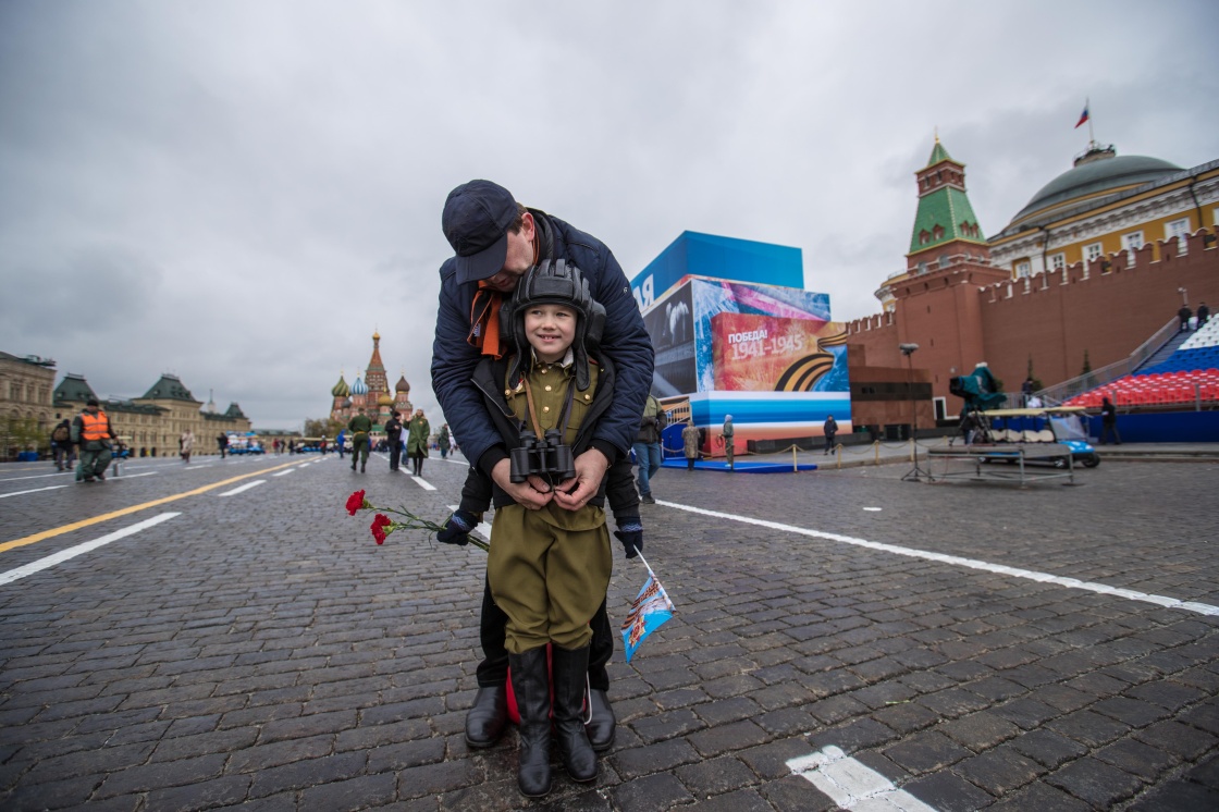 5月9日,在俄罗斯首都莫斯科,一名儿童在大人的陪伴下前往无名烈士墓为在战争中牺牲的士兵献花。