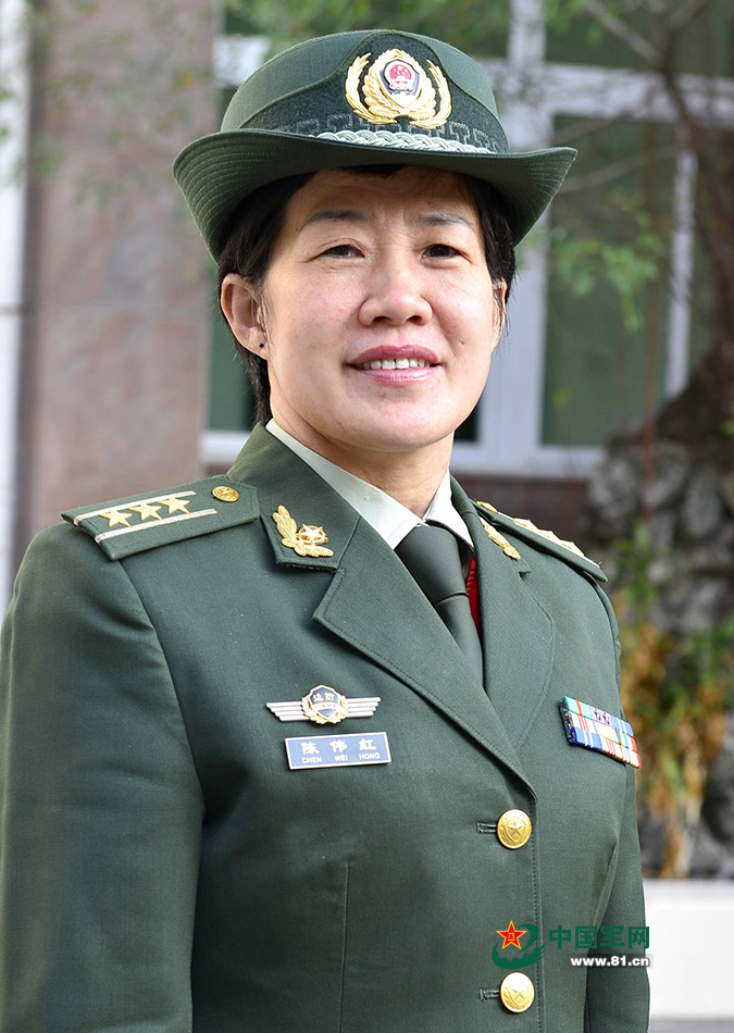 这张照片摄于2007年,当时,陈伟红身着一套笔挺的橄榄绿军服,佩戴军绿色卷檐帽、领花、资历章等,黄色的标志与绿色军装融合在一起,显得特别威武。
