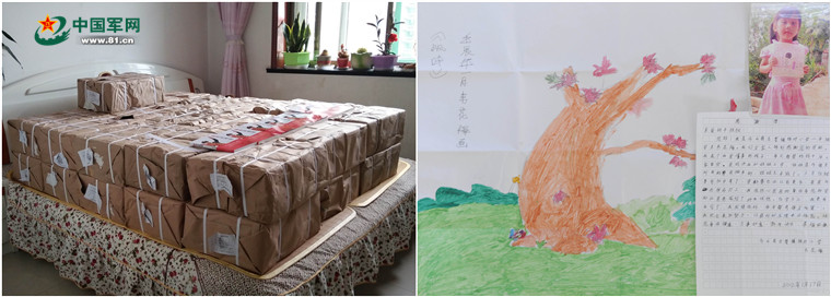 拼版照片:左:牛何松的自传新书摆满了自家卧室;右:贫困孩子韦花梅写来的感谢信。