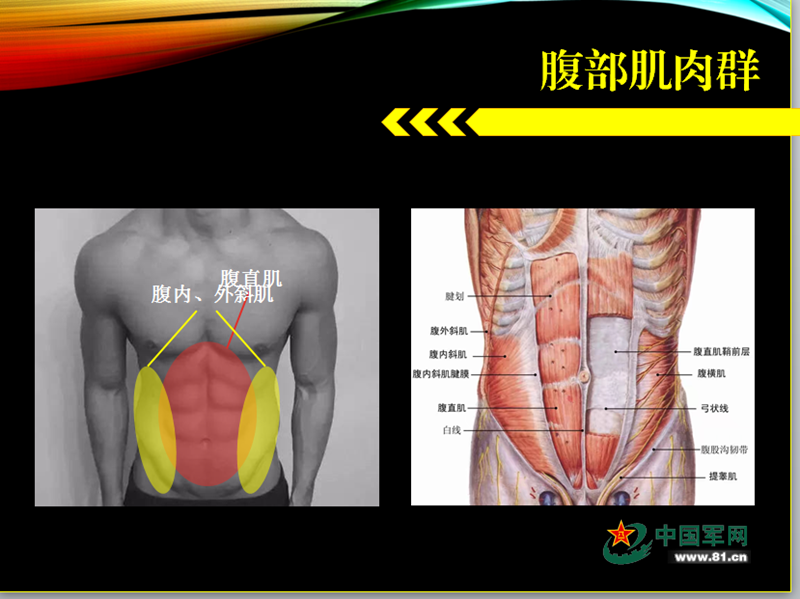 腹肌是人体结缔组织组成中的重要部分,包括腹直肌、腹外斜肌,腹内斜肌和腹横肌。腹部肌肉对于腰椎的活动和稳定性有相当重要的作用,合理训练带来的强大腹部肌肉可以避免腰部疾病。