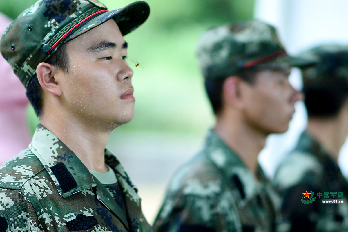 是什么让黄蜂如此嚣张?其实,不能怪黄蜂。现场,数十名新兵一字排开,正在进行军姿训练,个个敛气凝神,站如轻松,只见脸上、手上的汗珠不断往外渗、不时滴落。对黄蜂而言,或许真没不清它们眼前的是人,还是会滴水的树。