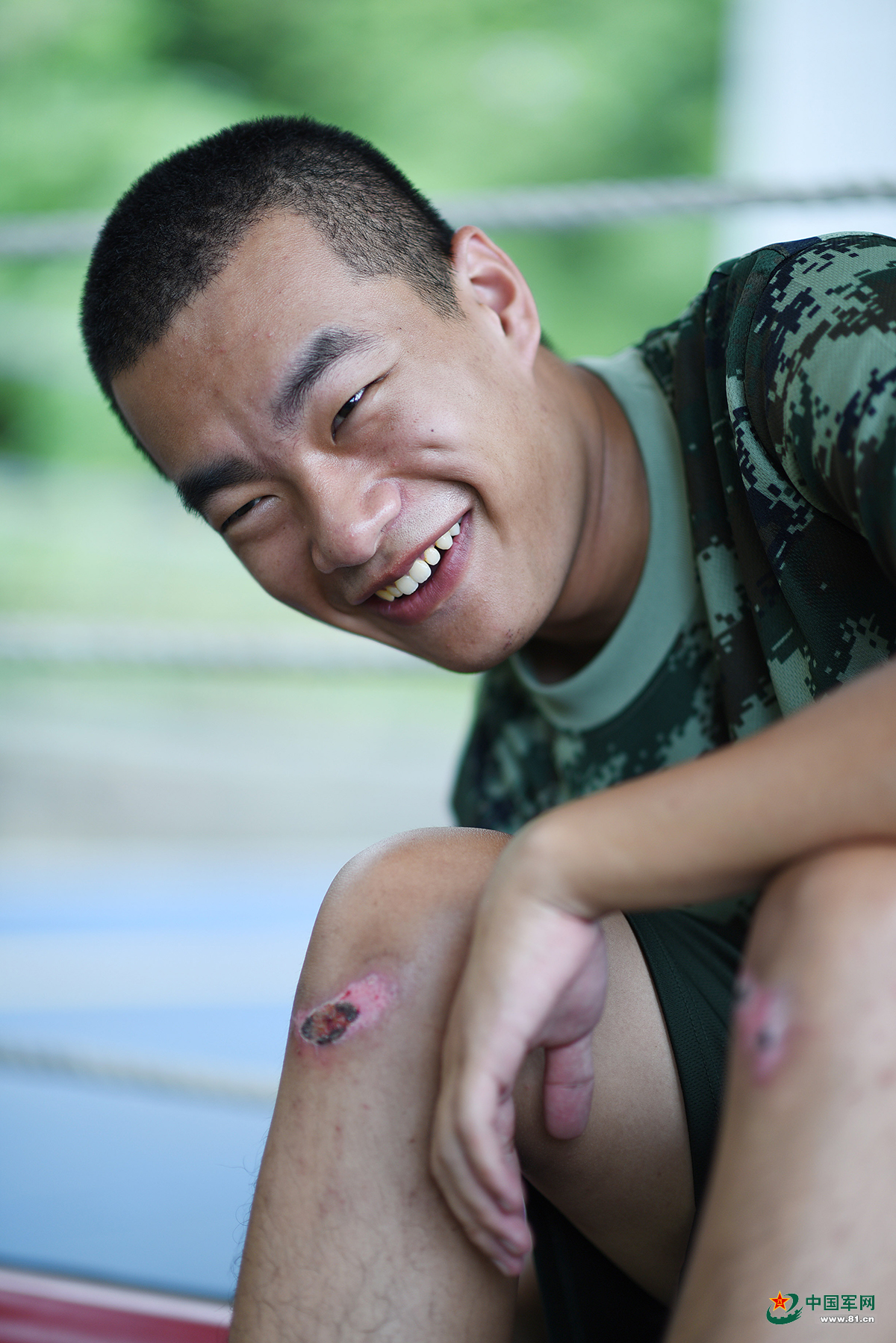 图为一名新兵膝盖被磕伤,仍然保持乐观的态度,坚持到训练场与战友们一起训练。