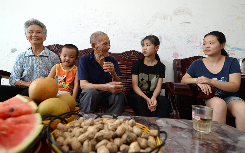 居住在江西省兴国县的99岁老人朱万陵(中)在给家人讲述当年参加红军的故事(7月30日摄)。 新华社记者 彭昭之摄