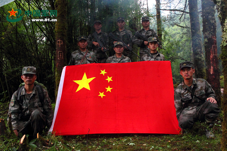 官兵自豪地展开国旗宣示主权。(李驰 摄)