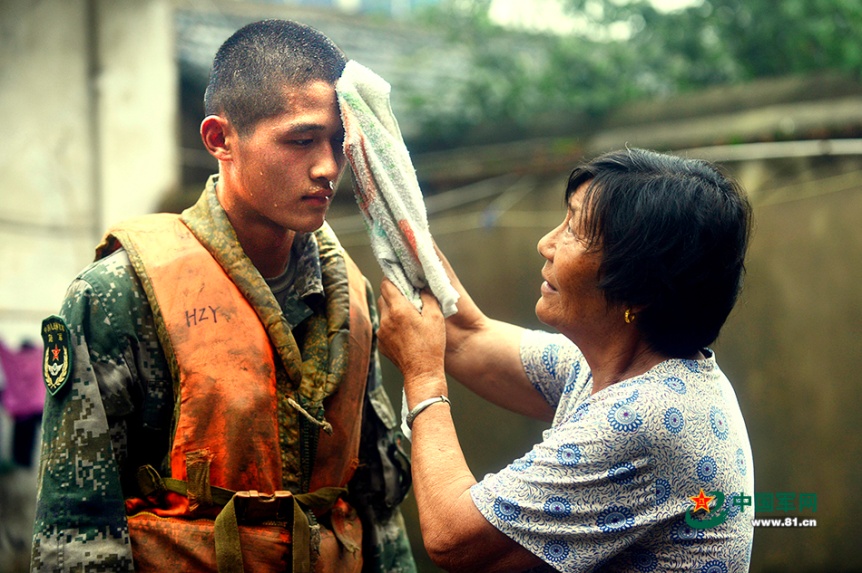 2016年7月6日,老妈妈拿着一条热毛巾,拥上来给列兵胡兆洋擦汗。殷永达 宋志成 谢浩 摄影