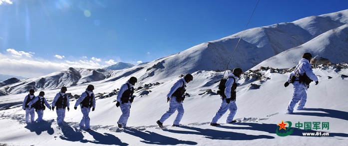 2017年4月8日,新疆军区某边防团奥尔托苏边防连巡逻分队对奥尔托苏山口实施武装巡逻,巡逻官兵翻高山、越冰河不畏严寒缺氧,乘马在海拔3986米的边防线上踏雪巡逻,确保边境安全稳定。刘晓东 摄影