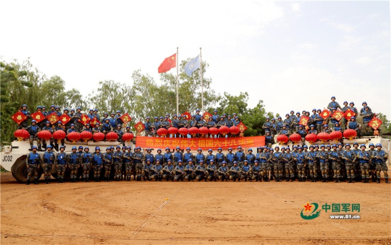 2017年9月24日,国庆节前夕,中国第5批赴马里维和部队官兵拍摄喜迎国庆、祝福祖国的视频。韩立建 摄影