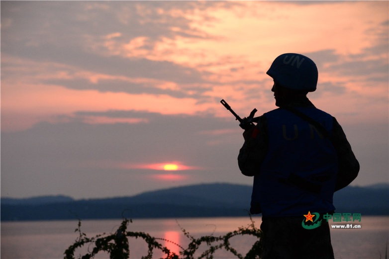 2017年9月27日 迎着清晨的第一缕阳光,中国赴刚果(金)维和工兵分队官兵手握钢枪岿然不动。柳军 摄影