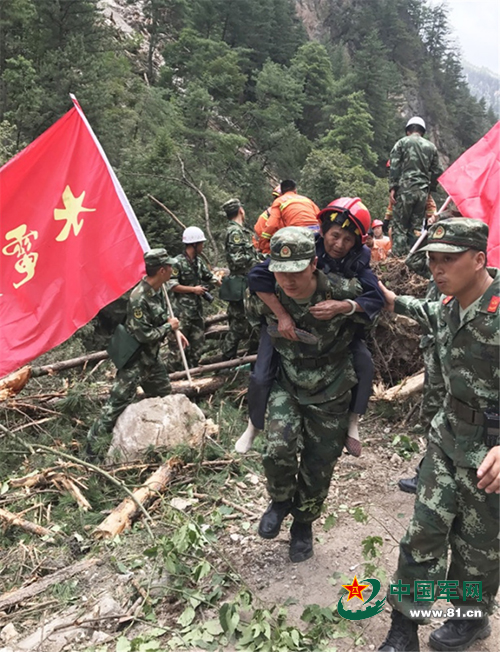2017年8月9日,驻成都武警水电官兵在九寨沟神仙池路口救助受困群众。葛强俊 曹峰 摄影报道