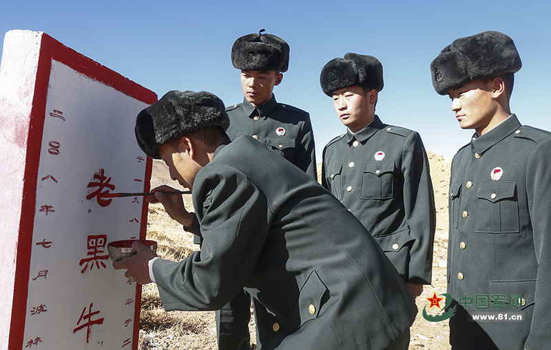 11月29日,退伍老兵们为老黑牛墓碑描红。(刘晓东摄)