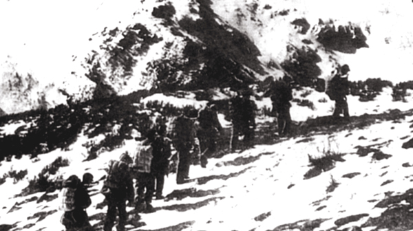 1935年6月8日,中共中央、中革军委指示中央红军迅速前进,翻越夹金山,夺取懋功理番,不顾一切困难,与红四方面军直接会合。红二师侦察北进懋功的道路,查报沿途粮食情况,为与红四方面军会师创造条件。担任先遣队的红四团,在师长陈光的率领下,6月11日,到达雪山脚下,准备翻越夹金山。第二营是前卫营,第六连是前卫连,个个手持木棍,在雪中探路。走在前面的用刺刀、铁铲在雪中挖踏脚坑,后面的紧跟其后往上爬。指战员们顶风雪,战严寒,手拉手,饿了就啃两口干粮,渴了就抓一把雪放在嘴里,累了也不敢休息。为了不让一人掉队,发扬友爱精神,互相搀扶着,一步一停、一步一喘地向上攀爬。红四团指战员怀着革命必胜的信念,发扬不怕苦不怕死的革命精神,以顽强的毅力,战胜风雪严寒和高山缺氧等重重艰难险阻,终于翻过长征路上的第一座大雪山。
