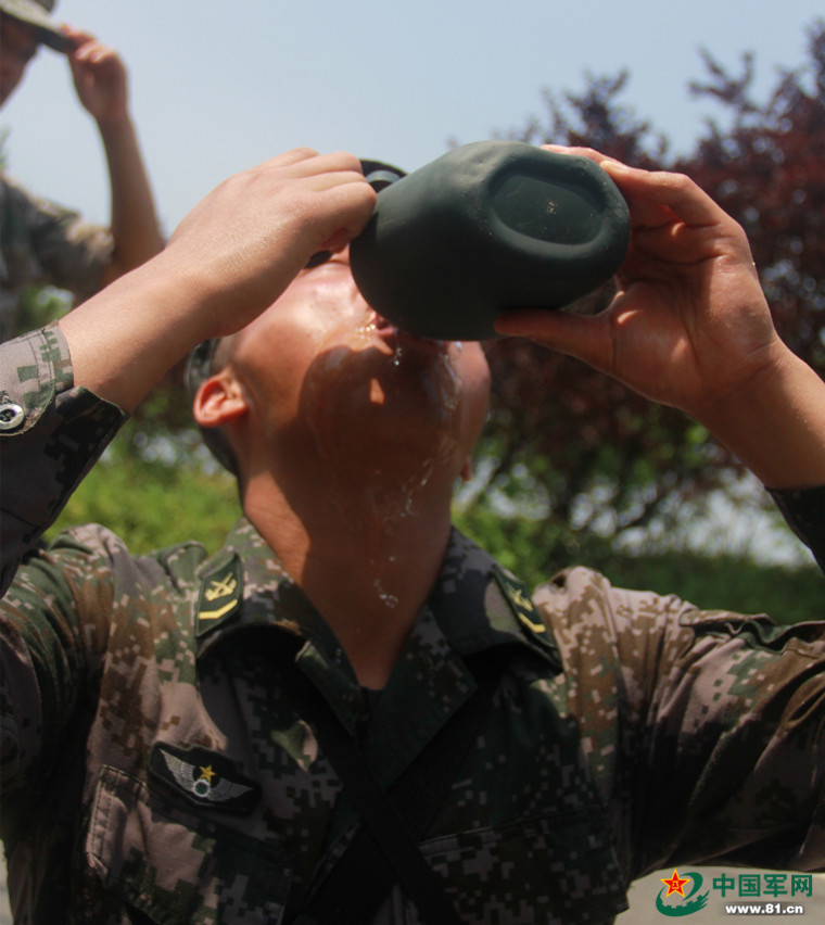 【军医支招】为防止大运动量后出现急性脱水和中暑,训练间隙应及时补充水分,在多饮水的同时还应注意补充一些含电解质的液体。一旦有人出现中暑症状,应就地实施抢救。中暑症状较轻者,要及时卸下武器装备、敞开衣物,补充淡盐水,或口服人丹、十滴水、藿香正气水等药物;严重者要尽快后送治疗。
