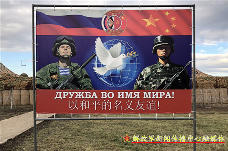 在中俄联合导演部的门前,树立着一幅展板。上面有中俄两军官兵的面部特写,文字以两国语言标注:“以和平的名义友谊”。