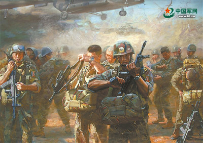 军旅画家李明峰参加第九届全国美展的油画作品《特侦班》,充满强烈的军味和阳刚之气,给我留下深刻印象。李明峰从小喜欢画画,是一个在基层部队成长起来的充满激情的业余美术创作骨干。他还是个超级军迷,这使得他在创作中总是能够巧妙地运用各类军事和装备知识,使作品更具时代气息和专业性。他在创作中有着明确的审美导向和家国情怀,能够在纷杂的历史表象中,敏锐地捕捉极具表现力的历史瞬间,巧妙地找到创作突破口。