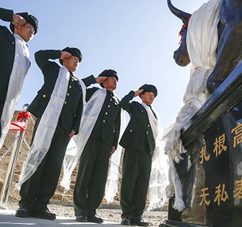退伍老兵即将离开连队时,向老黑牛雕塑敬最后一个军礼。