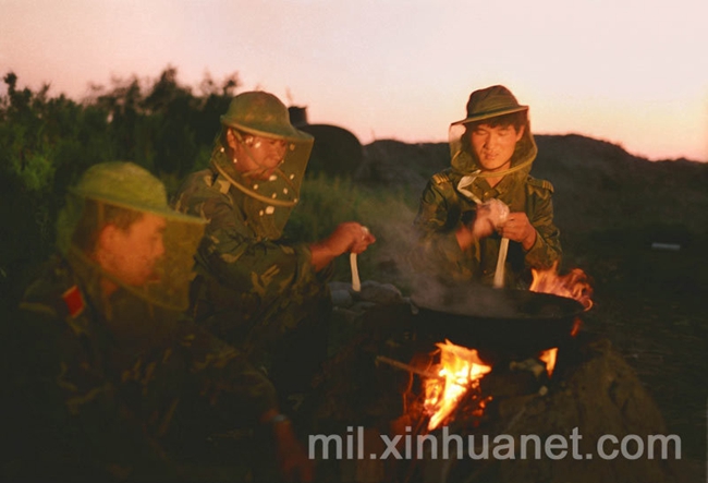 1994年8月,蚊虫王国三道河。这里蚊虫多时能遮天蔽日,狂时能叮伤牛羊。官兵户外执勤巡逻不得不戴上防护帽。前哨班的战士在烧火揪面片。