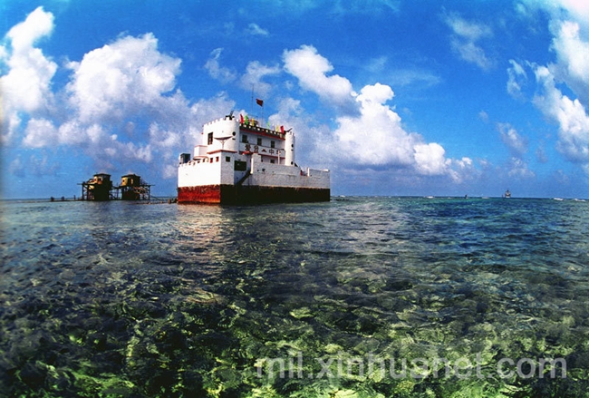 1995年3月,矗立在蓝天碧水之间的南沙华阳礁礁堡 。