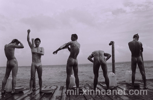 1995年3月,南沙东门礁。守礁官兵淡水限量供应,为省水战士“干洗澡”。